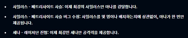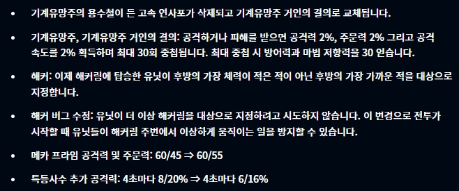 특성 부분에서는 자동방어체계의 변화가 가장 두드러지며, 그 외에는 기계유망주, 해커, 메카 프라임, 특등 사수 특성들의 효과가 일부 조정되었습니다.