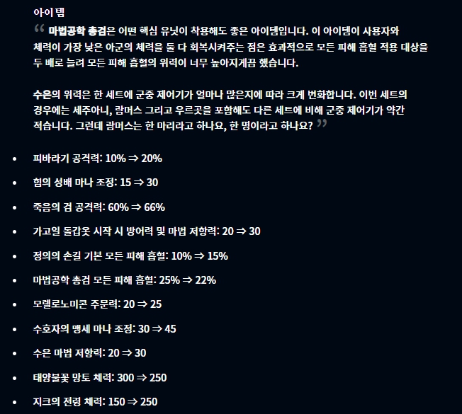 그 외에는 조합 아이템 모루 선택지가 늘어난 것이 핵심 아이템을 만들어줄 가능성을 높여서 큰 변화라고 생각되네요.