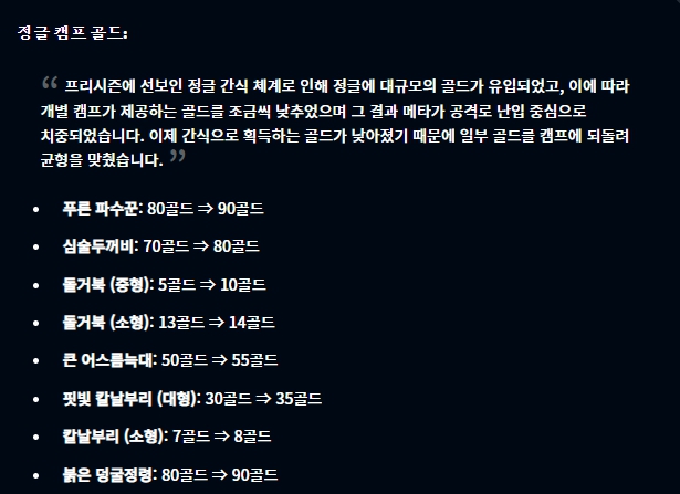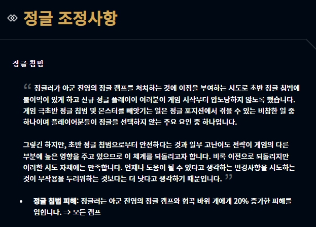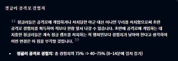 아군 정글 몬스터들에게 더 높은 데미지가 들어가도록 변경되었고, 또한 정글러들이 정글 몬스터를 처치하여 얻는 골드도 전체적으로 늘어났습니다. 또한 정글러가 초반 아군 공격로 미니언을 처치하는 경우 획득하는 경험치가 감소되었습니다.