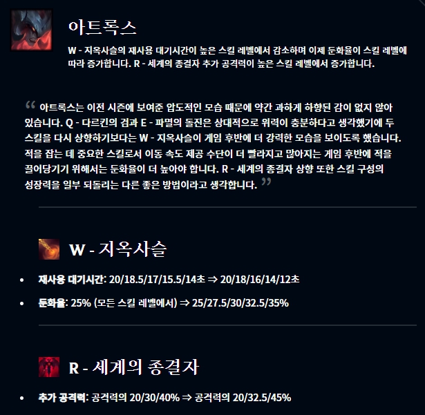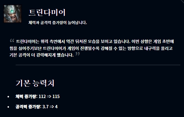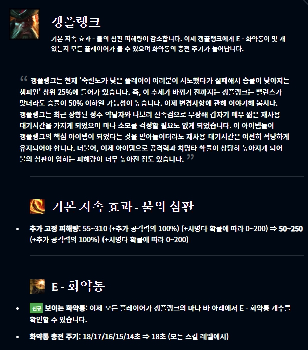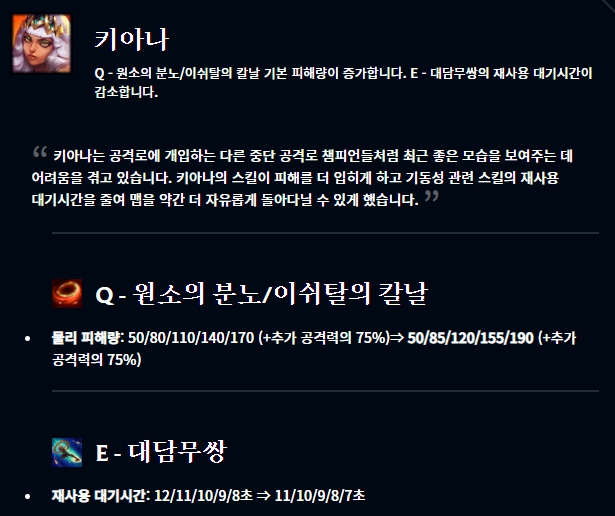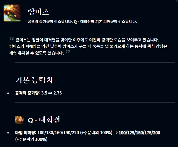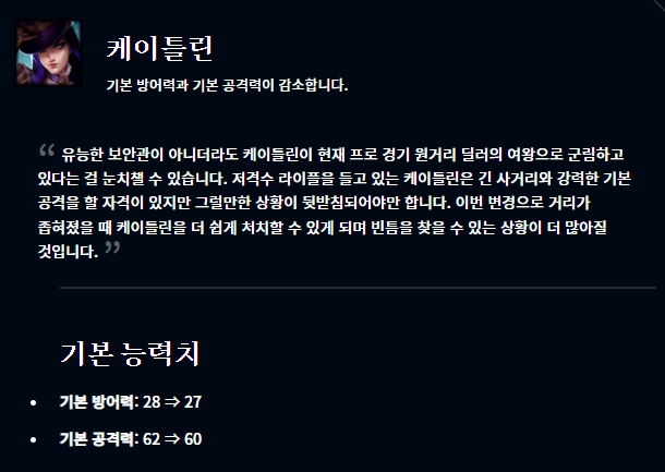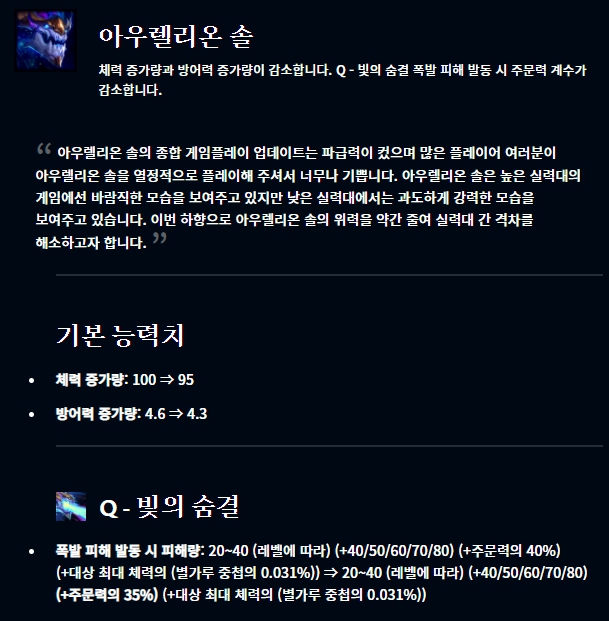 반면 아우렐리온 솔, 케이틀린, 갱플랭크, 람머스, 트위치, 자야, 요릭은 너프되었습니다.