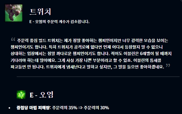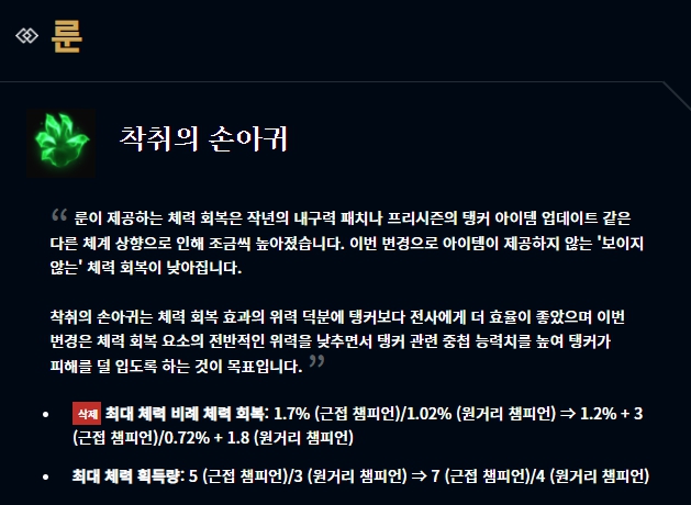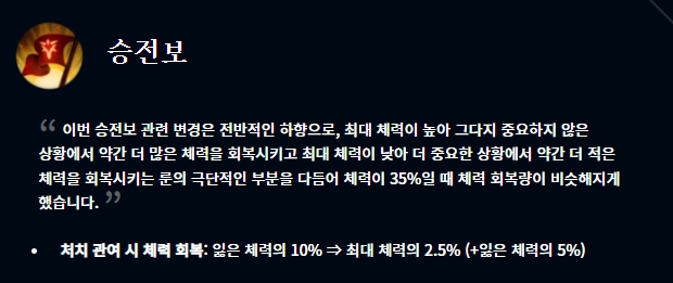 착취의 손아귀는 체력 회복 효과가 감소, 승전보는 잃은 체력의 10%가 아니라 최대 체력의 2.5% (+잃은 체력의 5%)로 변경되었습니다.