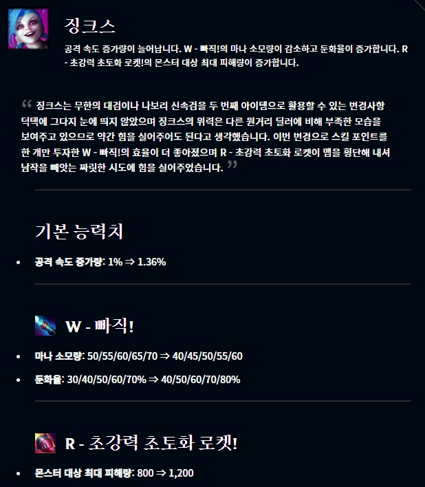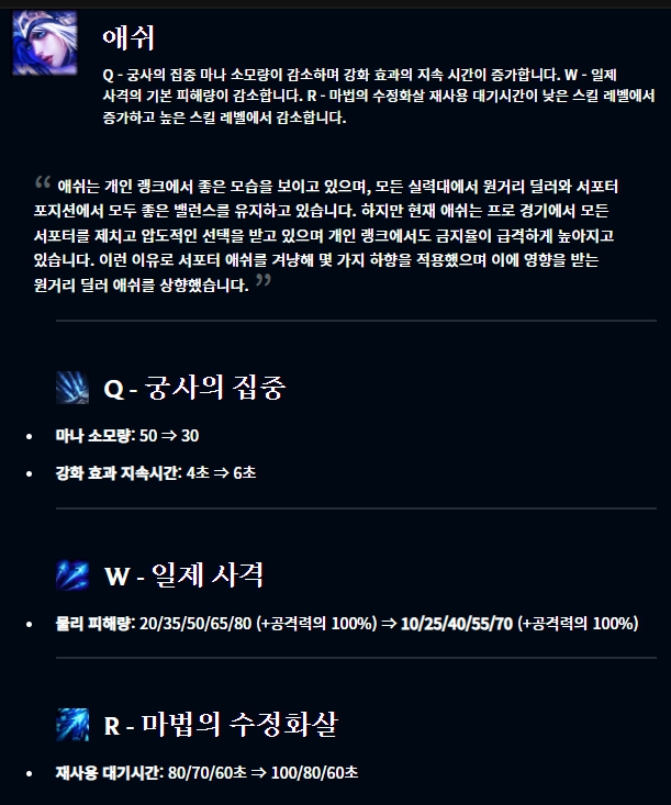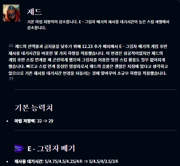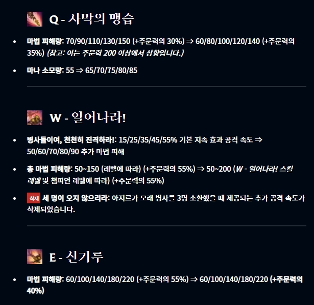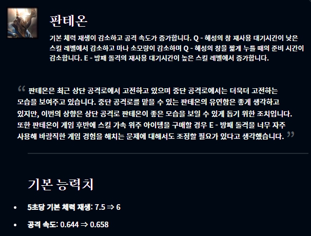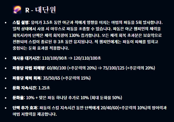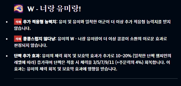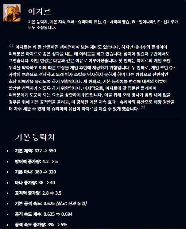 유미, 애쉬, 아지르, 판테온, 제드의 경우 조정이 있습니다. 버프로 봐야 할 지, 너프로 봐야 할 지는 직접 플레이를 하면서 느껴보는게 좋겠죠?