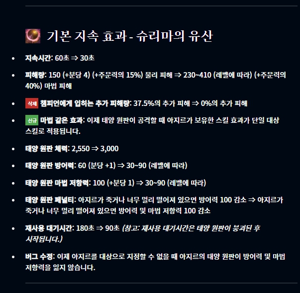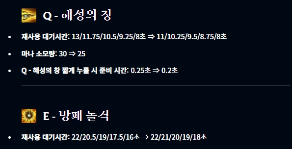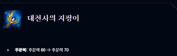 우주의 추진력의 추가 체력이 없어진 대신 주문력이 더 상승했습니다. 판금 장화는 이제 모든 기본 공격을 대상으로 피해량을 감소시키며, 대천사의 포옹 및 대천사의 지팡이는 주문력/체력이 살짝 너프되었습니다.