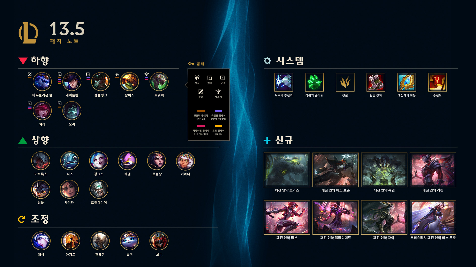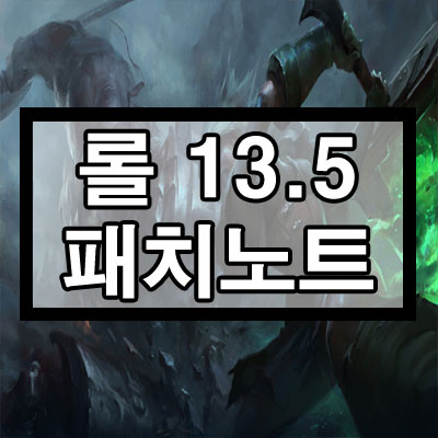 이번 시간에 알아볼 것은 롤 13.5 패치노트입니다. 이번 13.5 패치에서는 많은 챔피언들이 변경되었고, 아이템 및 정글 관련 사항, 룬까지 변경되었습니다. 변경된 점이 많은 만큼 게임을 플레이하기 전 한번 살펴보고 가는게 좋겠죠? 그러면 어떤 점들이 어떻게 변경되었는지 살펴보도록 하겠습니다.