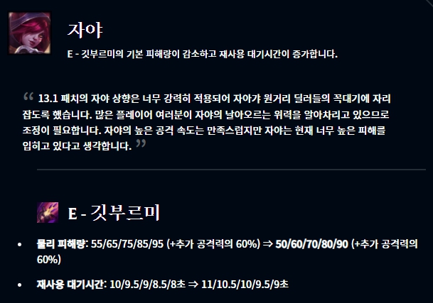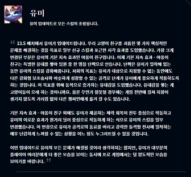 많은 변경점이 있었던 13.5 패치였습니다. 과연 협곡에 어떠한 변화가 나타나는지 한번 지켜보도록 하죠. 그러면 이번 포스팅은 여기서 마무리하도록 하고 다음번에는 또 다른 글로 다시 찾아오도록 하겠습니다. :)