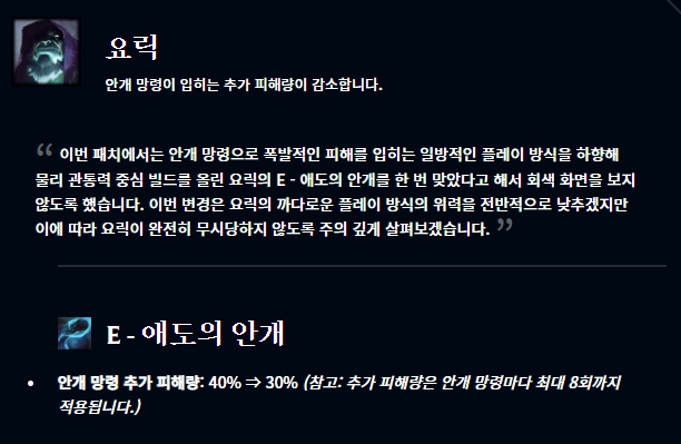 착취의 손아귀는 체력 회복 효과가 감소, 승전보는 잃은 체력의 10%가 아니라 최대 체력의 2.5% (+잃은 체력의 5%)로 변경되었습니다.