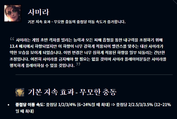 13.5 패치에서는 아트록스, 피즈, 징크스, 케넨, 르블랑, 키아나, 럼블, 사미라, 트린다미어가 버프되었습니다.