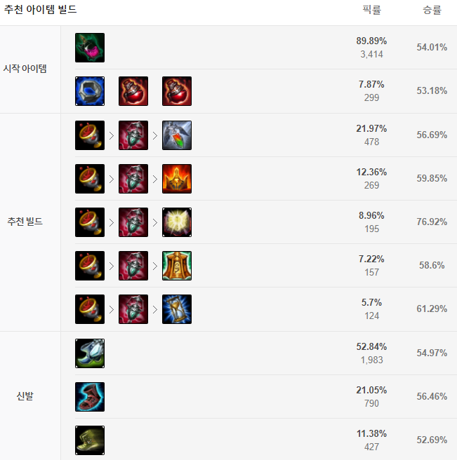 탑 룰루는 첫 아이템으로 아테나의 부정한 성배를, 두 번째 아이템으론느 향로를 많이 띄워주는데요, 이 둘의 공통점은 바로 유틸형 아이템이라는 점으로 아군을 보호 및 강화하는데 특화되어 있는 아이템들입니다. 3코어 아이템도 상대방에 CC기가 많으면 미카엘, 우리팀에 이니시에이팅이 부족하면 슈렐리아, 무난한 경우 구원 아이템을 띄워줍니다.