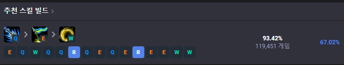 1레벨에는 E스킬, 2레벨에는 Q스킬, 3레벨에는 W스킬을 찍어준 뒤 이후 4레벨부터는 R-Q-E-W 순서로 스킬을 마스터해주시면 됩니다.