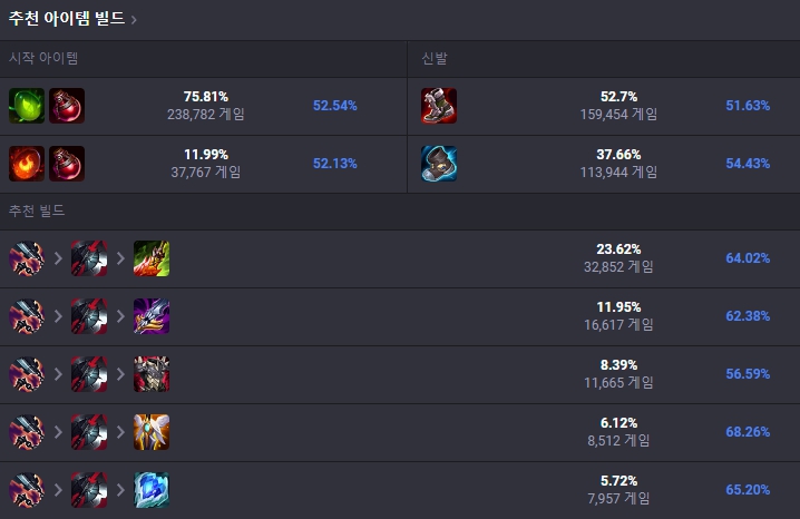 처음 시작 아이템은 새끼 이끼쿵쿵이(초록이)로 시작하여 첫 코어 아이템으로는 선혈포식자를 올려줍니다. 선혈포식자를 올린 뒤 신발은 적들을 보고 판금 장화나 헤르메스의 신발을 띄우고 이후에는 칠흑의 양날도끼까지 고정으로 띄워줍니다. 이후에는 죽음의 무도, 멜모셔스의 아귀, 가시 갑옷, 수호 천사 등 상황에 맞게 유동적인 템트리를 올려줍니다.