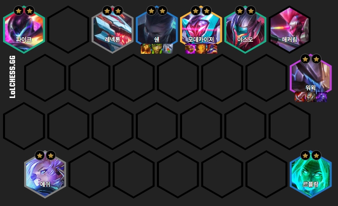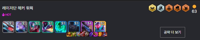 가장 좋은 스타트는 초반 애쉬, 레넥톤, 야스오로 레이저단(3)을 만든 뒤 아무 싸움꾼이나 결투가를 한 명 껴서 특성을 살려주는게 좋습니다. 어느정도 덱이 완성된다면 해커 기수에 워윅을 넣어 적 구석으로 진입하게 하여 핵심 딜러를 처리할 수 있게 합니다. 플레이어들을 둘러보며 상대 적 딜러의 위치를 주기적으로 확인하여 헤카림과 워윅의 위치를 조절하는 게 좋습니다.