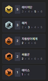 덱을 완성시켰을 때 챙길 수 있는 특성은 레이저단(5), 해커(3), 자동방어체계(2), 싸움꾼(2), 에이스(1)입니다.