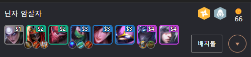 닌자 암살자덱을 보시면 상당히 아이템이 많이 필요한데요, 뭐 굳이 이대로 딱 맞출 필요는 없다고 생각합니다. 다만 아칼리에게 총검과 푸른 파수꾼 아이템은 필수로 주시고, 만약 고연포가 너무 안나온다면 보석 건틀릿도 괜찮습니다. 쉔같은 경우는 혼자 맨 앞 포지션이기 때문에 가고일의 돌갑옷을 주면 그만큼의 효율을 내니 가급적 가고일의 돌갑옷을 주는 것을 추천드립니다. 초반에는 연승을 하기 힘든 덱이지만 초반을 무난하게 버티면 후반에 닌자4 시너지가 모였을 때를 기점으로 확 강해지는 덱으로, 승리까지 가는 것은 어렵습니다만 4등 이내에 드는 것은 어렵지 않습니다.