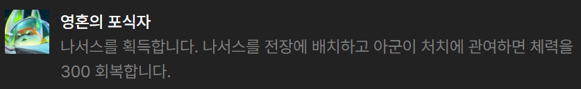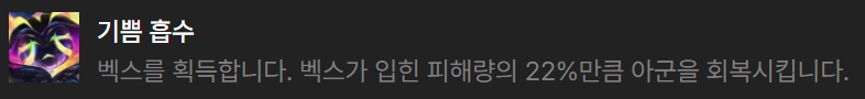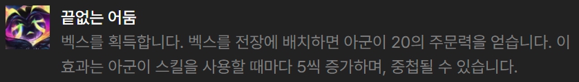 마스코트 리롤 벡스덱에서 좋은 영웅 증강체는 수호자 영혼(말파이트), 영혼의 포식자(나서스), 기쁨 흡수(벡스), 끝없는 어둠(벡스)입니다.