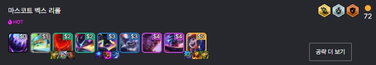 마스코트 리롤 벡스덱에서 좋은 영웅 증강체는 수호자 영혼(말파이트), 영혼의 포식자(나서스), 기쁨 흡수(벡스), 끝없는 어둠(벡스)입니다.
