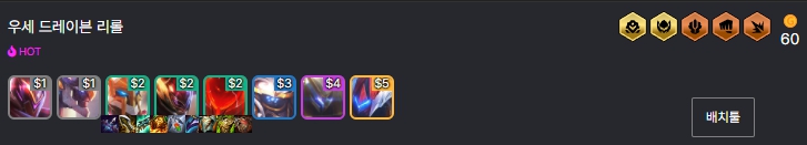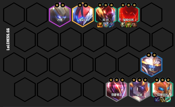 우세 드레이븐덱 구성은 갱플랭크, 오공, 드레이븐, 리신, 말파이트, 잭스, 가렌, 레오나로 이루어져 있습니다.