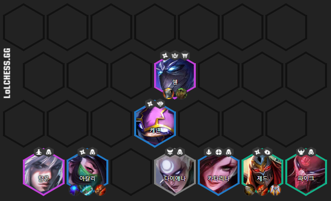 닌자 암살자덱은 위와 같은 식으로 배치해주시면 되는데요, 후반의 경우 상대방의 중요 딜러진에게 암살자 혹은 그림자 시너지를 가지고 있는 챔피언이 빠르게 접근하도록 배치를 그에 맞게 변경해주시면 되겠습니다. 가장 기본적인 것은 쉔이 앞에서 탱킹을 하고, 케넨이 바로 쉔 뒤에서 궁극기로 스턴을 여러명 맞추면서 암살자, 그림자 시너지를 지닌 챔피언들이 후방에서부터 진영을 무너뜨리는 것이죠.