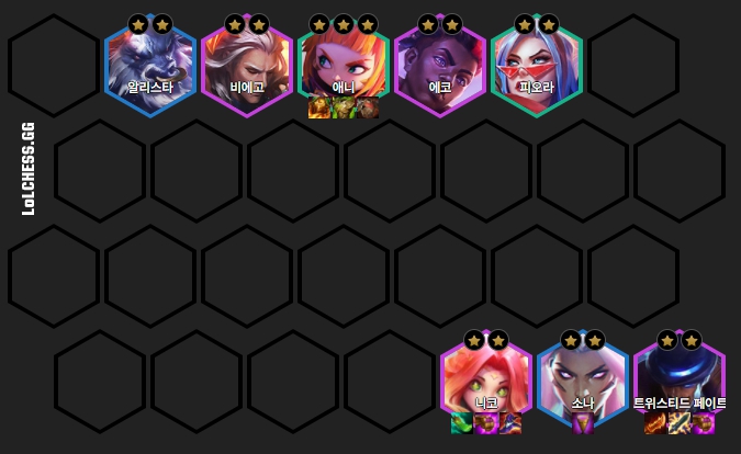 애니, 피오라, 소나, 알리스타, 니코, 비에고, 에코, 트위스티드 페이트로 이루어져 있습니다.