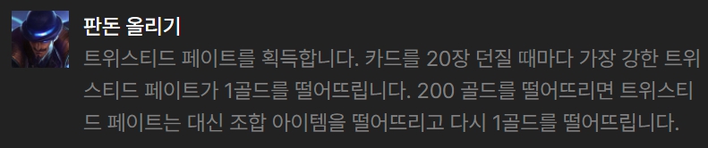 트위스티드 페이트에게 구인수의 격노검, 스태틱의 단검, 보석 건틀릿을 주면 됩니다. 트페가 나오기 이전에는 럭스나 다른 챔피언에게 대신 줘서 활용하는 방법이 있습니다. 애니에게는 탱커형 아이템을 몰아주면 되고, 남은 아이템들은 니코에게 주문력 아이템, 마나 관련 아이템을 주면 되겠습니다.