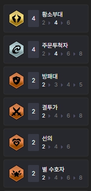 덱을 완성시키면 황소부대(4), 주문투척자(4), 방패대(2), 결투가(2), 선의(2), 별 수호자(2) 특성을 챙길 수 있습니다. 증강이나 뒤집개를 이용하여 황소부대(6)이나 주문투척자(6)을 노려보는 것도 좋습니다.