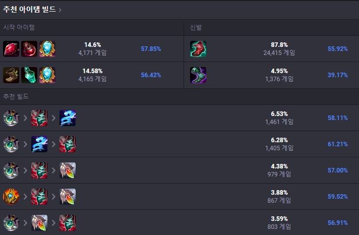 보통은 루비 수정과 밴들유리 거울, 포션 하나로 시작해주며, 이후 첫 코어 아이템으로 월석 재생기를 올려줍니다. 이후 아이오니아 장화를 띄워준 뒤 흐르는 물의 지팡이, 불타는 향로, 구원을 상황에 맞게 차례로 올려주면 되겠습니다.