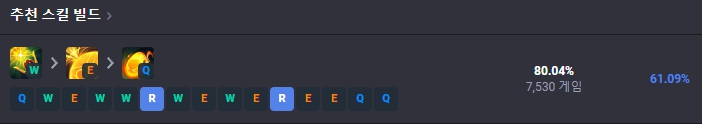 처음 시작 3레벨에는 Q, W, E 스킬을 하나씩 찍어주고 이후 4레벨부터는 R-W-E-Q 순서로 스킬을 마스터해주면 됩니다.