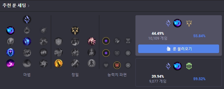 유틸형 서포터에게 잘 어울리는 콩콩이를 메인으로 사용합니다. 하위 룬으로는 마나순환 팔찌, 깨달음, 주문 작열을 들어주고, 보조룬으로는 정밀에서 침착과 최후의 일격을 들어주면 됩니다. 능력치 파편은 적응형 능력치 두 개 와 방어력으로 껴주면 되겠습니다.