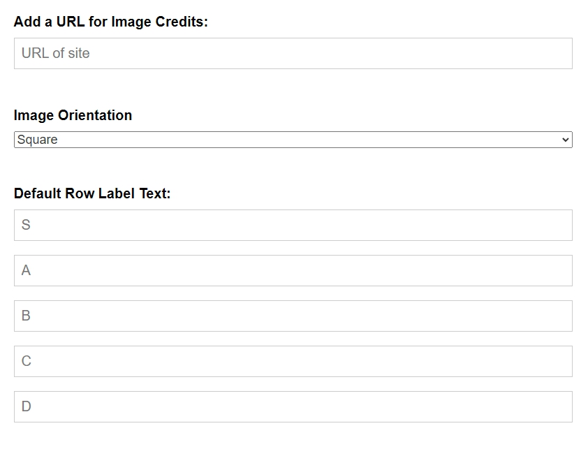 사이트의 URL을 입력해주고, 이미지 형태는 기본적으로 사각형으로 되어 있습니다. 그리고 이제 각 티어를 어떻게 구분할 것인지 적어주면 됩니다. 기본적으로 S, A, B, C, D이며 이걸 바꿔서 1티어, 2티어, 3티어 이런 식으로도 할 수 있겠죠? 개인적으로 직접 티어 리스트 템플릿을 만들려면 그만큼 이미지 파일이 먼저 수집되어야 하기 때문에 귀찮을 수도 있습니다.